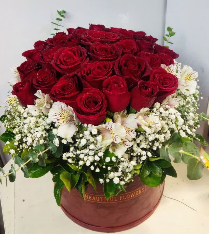 باکس گل طبیعی ترکیب رز هلندی قرمز و آلسترومریا سفید کد (۶۵)
