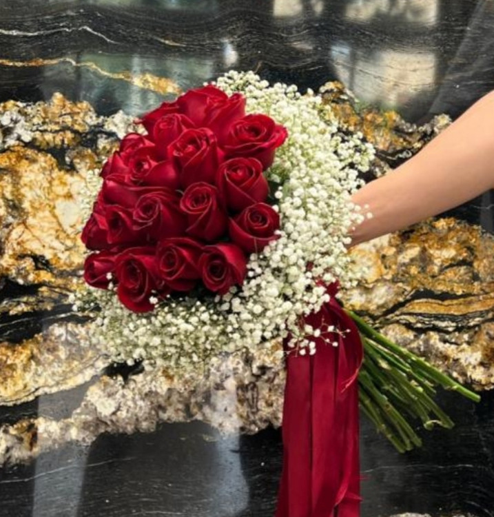دسته گل طبیعی رز هلندی قرمز و ژیپسوفیلا کد (۱۱۲)