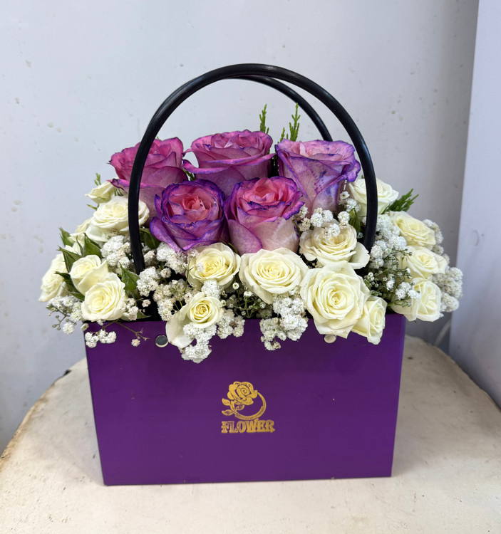 تعداد شاخه: ٥شاخه رز هلندى،يك دسته رز مينياتورى