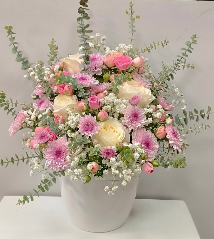 چهار شاخه رز سفيد،يك دسته داوودى،يك دسته رز مينياتورى صورتى،ژيسوفيلا